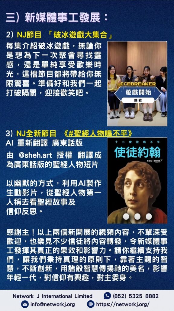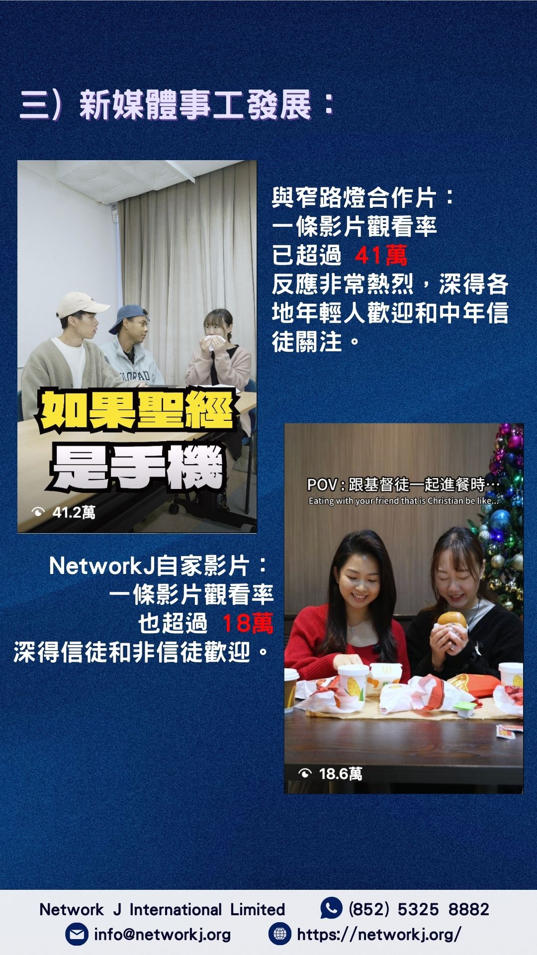 感謝主!以上兩個新開展的視頻內容,不單深受歡迎,也樂見不少信徒將內容轉發,令新媒體事工發揮其真正的果效和影響力。請你繼續支持我們,讓我們秉持真理的原則下,靠著主賜的智慧,不斷創新,用諸般智慧傳揚祂的美名,影響年輕一代,對信仰有興趣,對主委身。