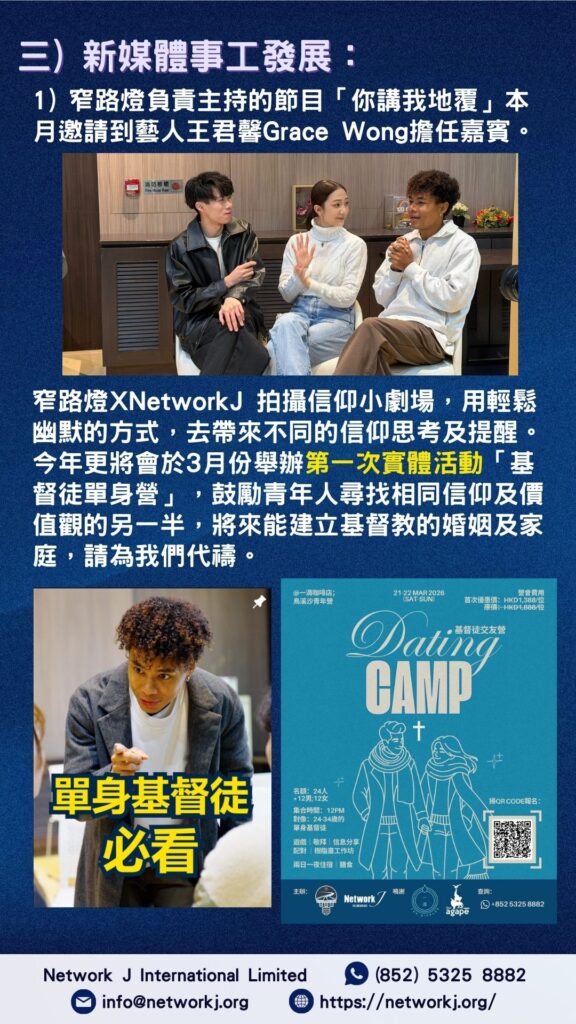 窄路燈XNetworkJ 拍攝信仰小劇場,用輕鬆幽默的方式,去帶來不同的信仰思考及提醒。今年更將會於3月份舉辦第一次實體活動「基督徒單身營」,鼓勵青年人尋找相同信仰及價值觀的另一半,將來能建立基督教的婚姻及家庭,請為我們代禱。