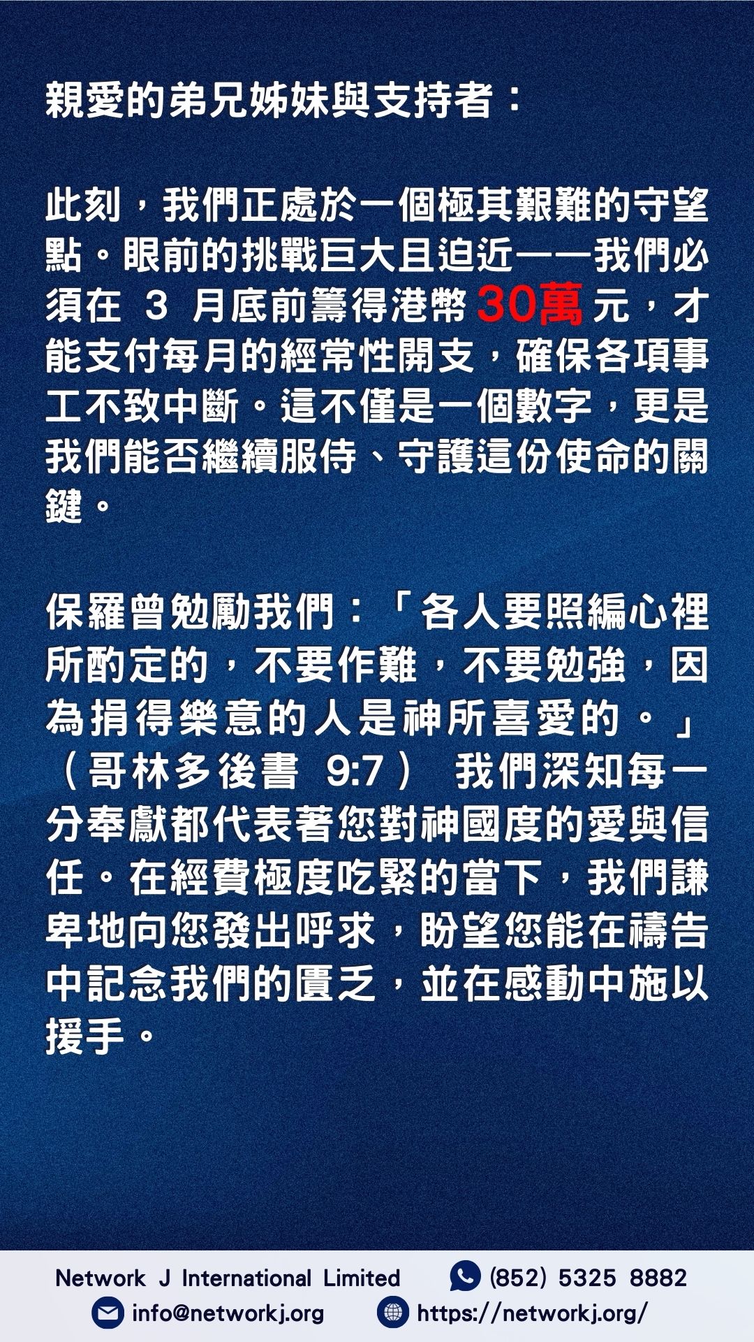 此刻,我們正處於一個極其艱難的守望點。眼前的挑戰巨大且迫近——我們必須在 3 月底前籌得港幣 30萬元,才能支付每月的經常性開支,確保各項事工不致中斷。這不僅是一個數字,更是我們能否繼續服侍、守護這份使命的關鍵。