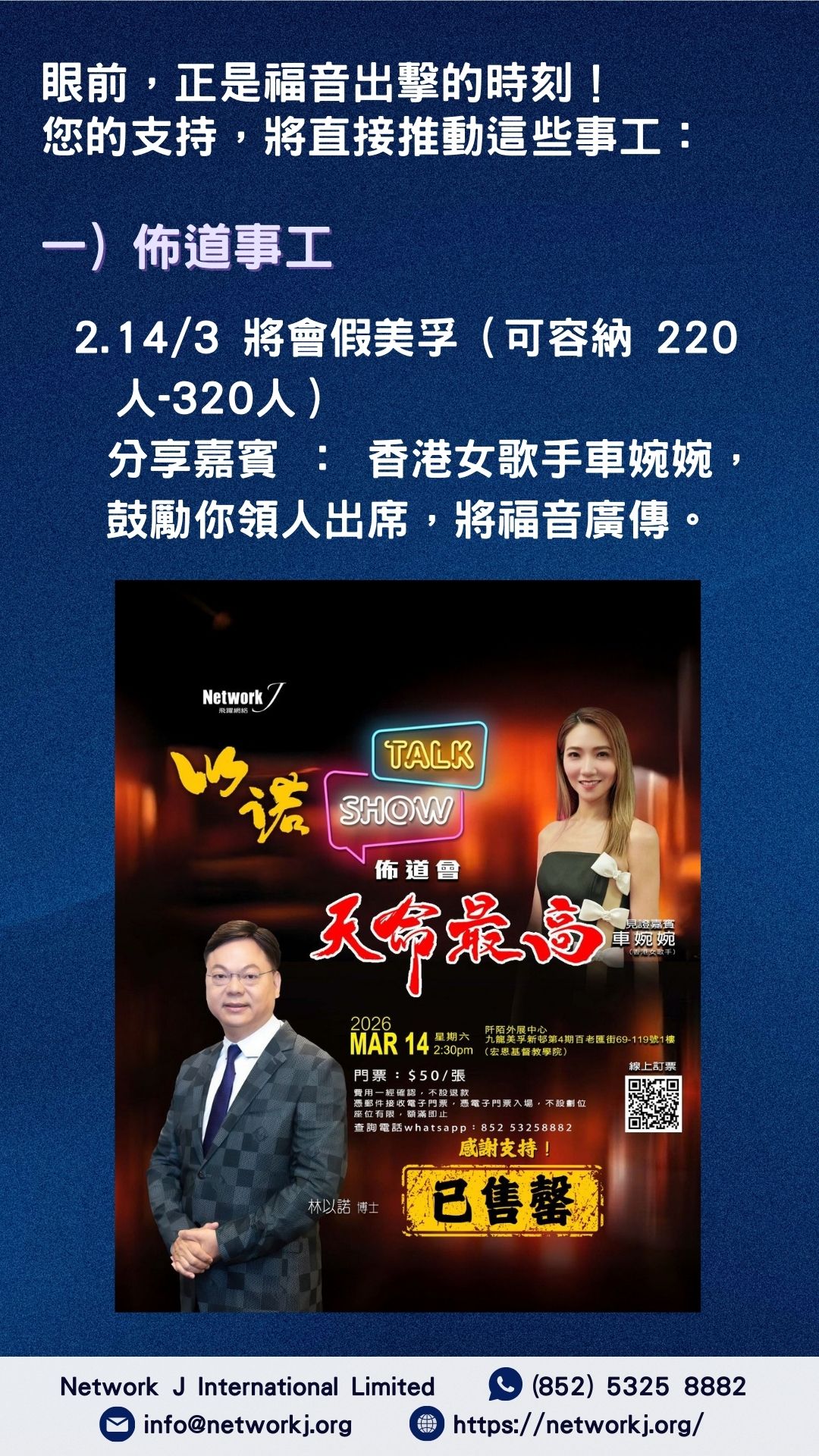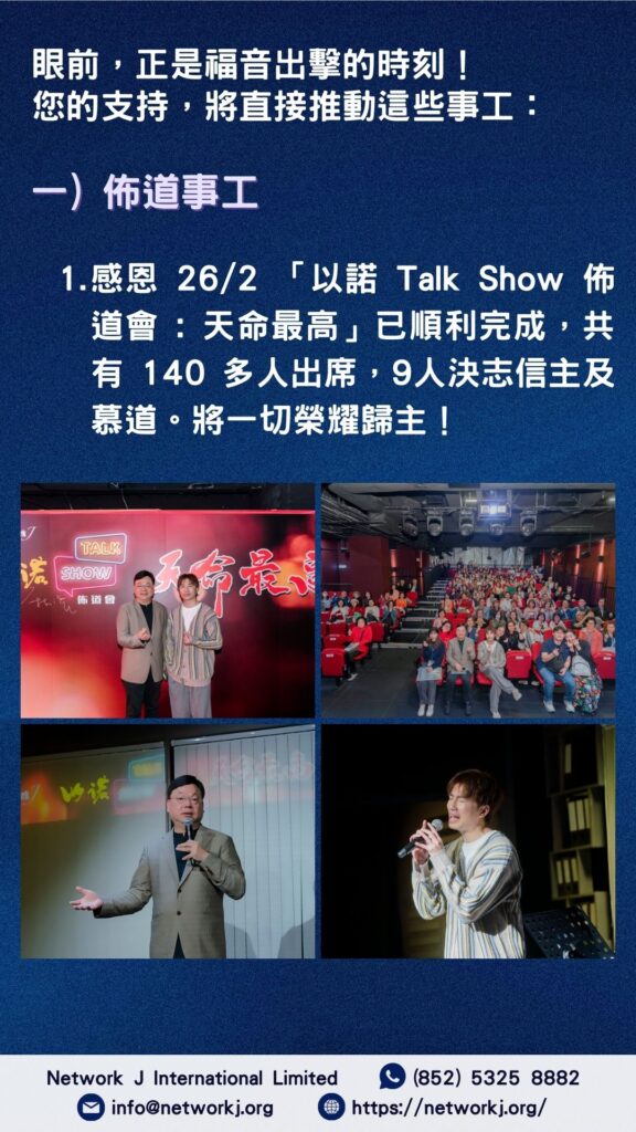 感恩 26/2 「以諾 Talk Show 佈道會 : 天命最高」已順利完成,共有 140 多人出席,9人決志信主及慕道。將一切榮耀歸主!