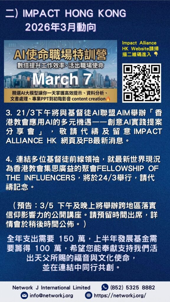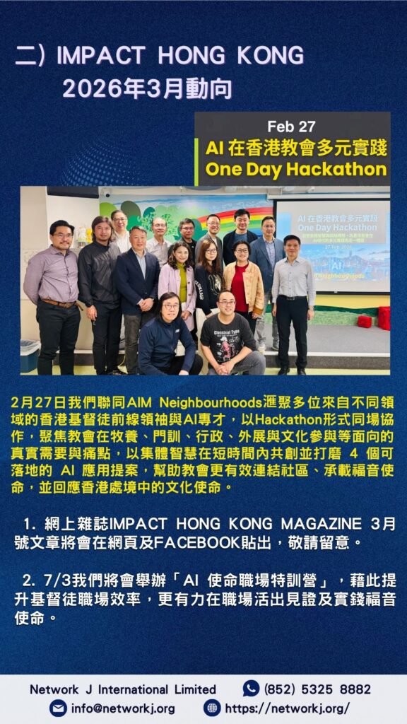 - 21/3下午將與基督徒AI聯盟AIM舉辦「香港教會應用AI的多元機遇——創意AI實踐提案分享會」,敬請代禱及留意Impact Alliance hk 網頁及FB最新消息。