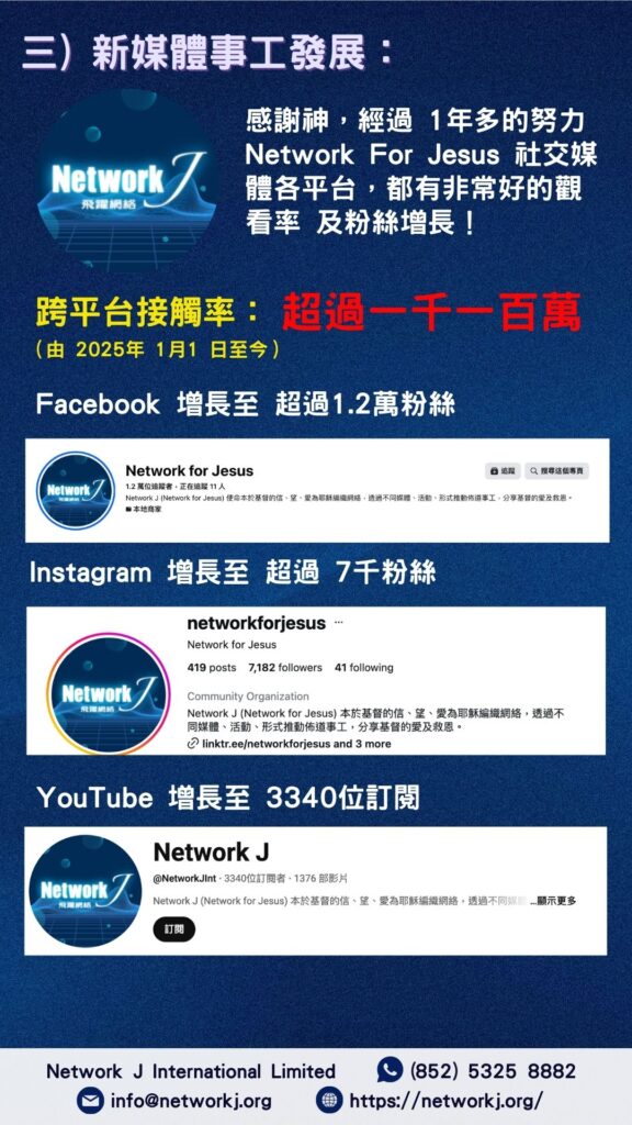 感謝神,經過 1年多的努力 Network For Jesus 社交媒體各平台,都有非常好的觀看率 及粉絲增長!