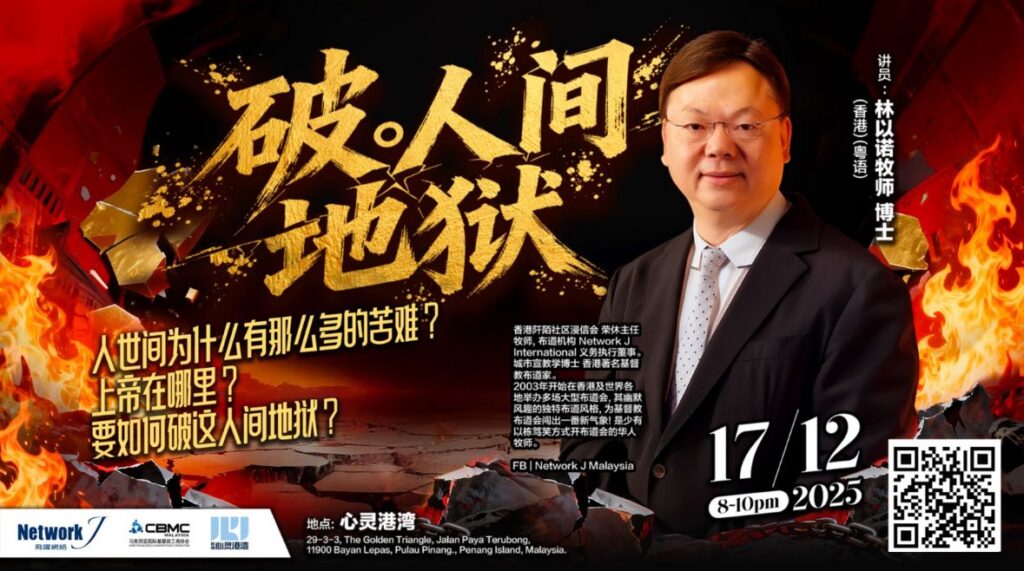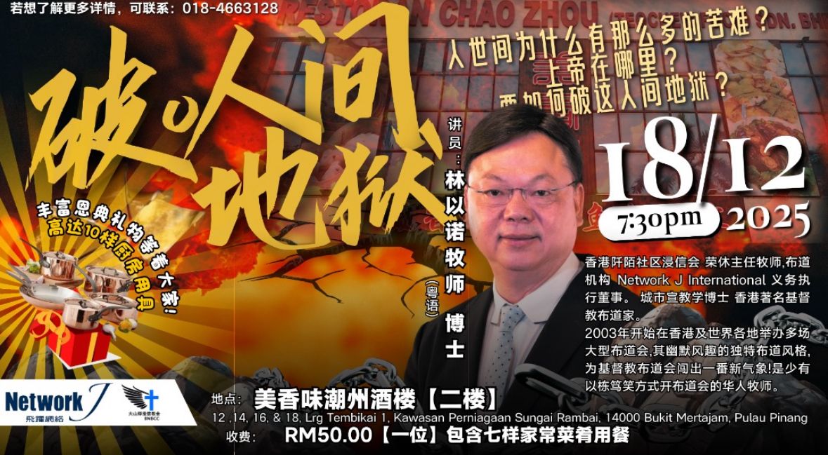 林以諾牧師即將在12月蒞臨檳城,分別位於大山脚及檳城,以 “破•人間地獄”爲主題主講兩堂福音聚會。