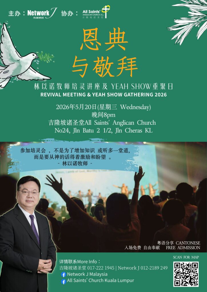 接下來5月20日,林以諾牧師將再度來到吉隆坡舉行信徒培靈講座及 Yeah Show 重聚日,歡迎弟兄姊妹出席!