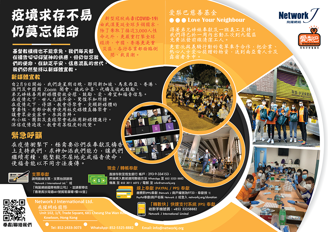 在疫情衝擊下,極需要你們在奉獻及禱告上支持我們,求神加添我們能力,讓我們